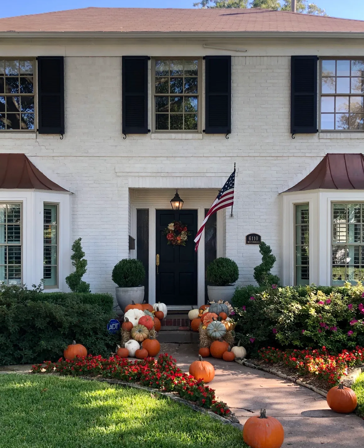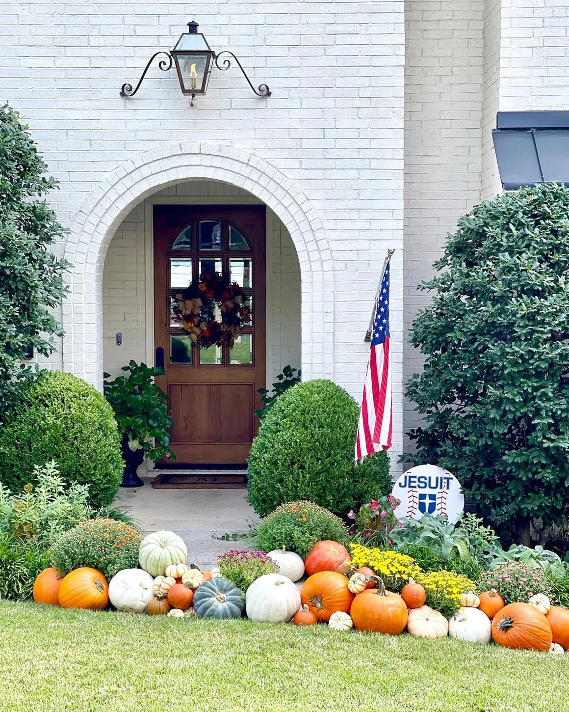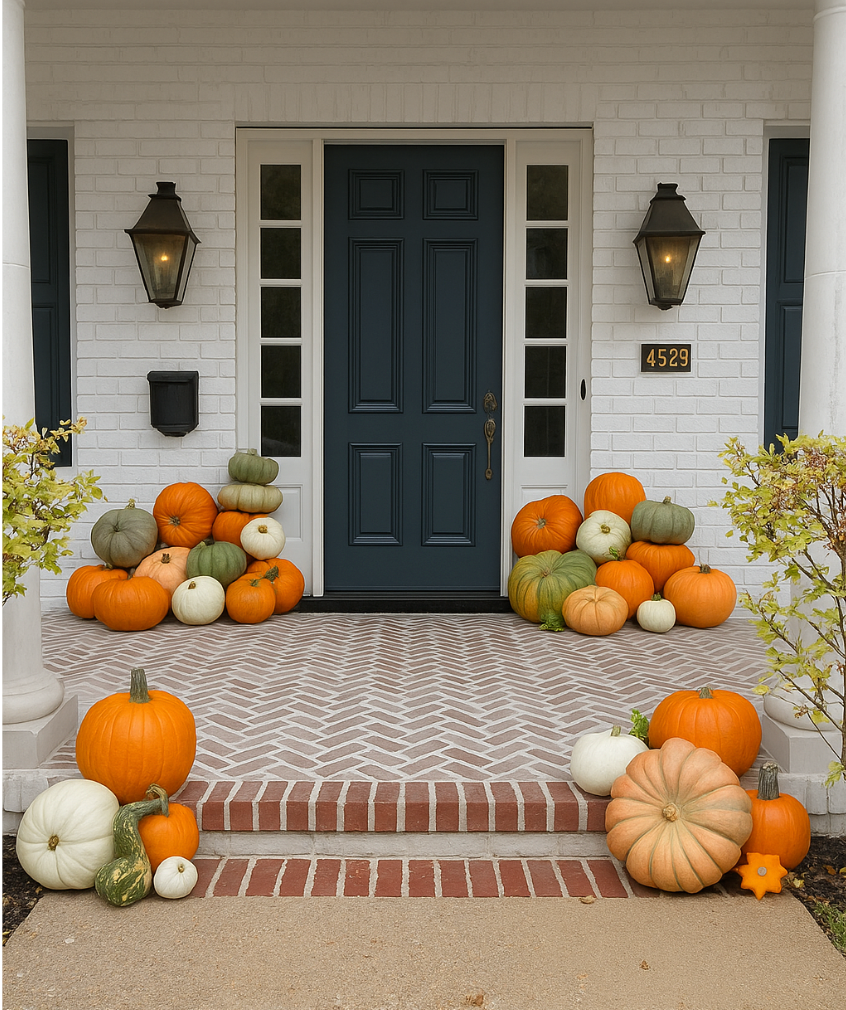 6 Large Jack O Lanterns, 6 Medium Jack O Lanterns, 6 White Ghost Pumpkins, an assortment of Pie Pumpkins, 8 Specialty Pumpkins and 2 Hay Bales. This package does not include design and layout. Front porch drop off included.